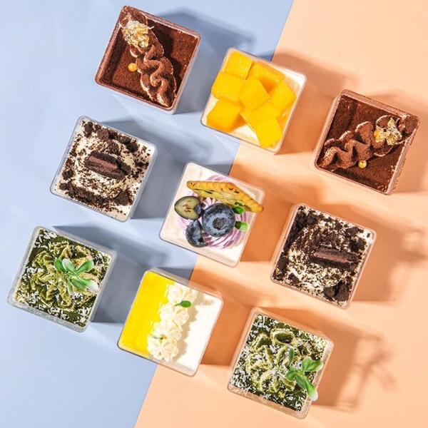 Vaso cubo salsa transparente de plástico PS muy usado como vaso para helados y postres y para presentación de ensaladas y entrantes en eventos y caterings.
