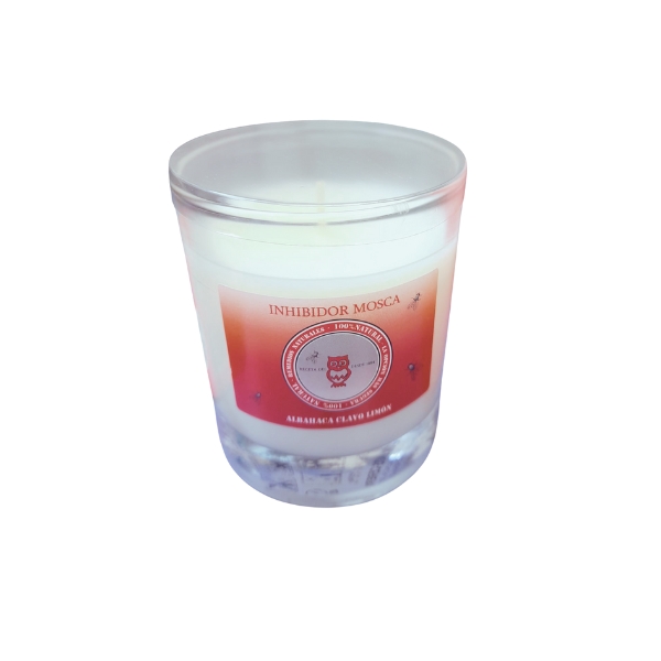 Vela en vaso de cristal transparente con cera blanca y perfume de albahaca, clavo y limón, un olor que desagrada a las moscas y hace que se alejen de nuestro entorno.