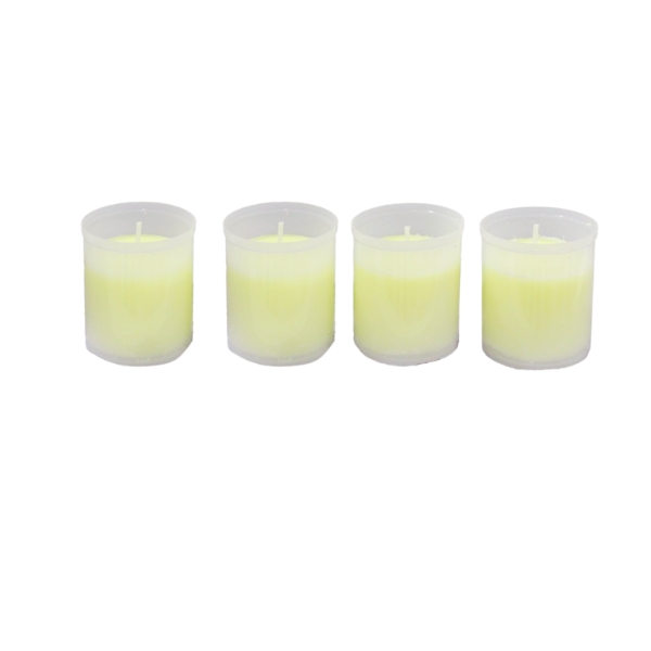 Pack de 4 velas color blanco en posavasos traslucido de plastico.