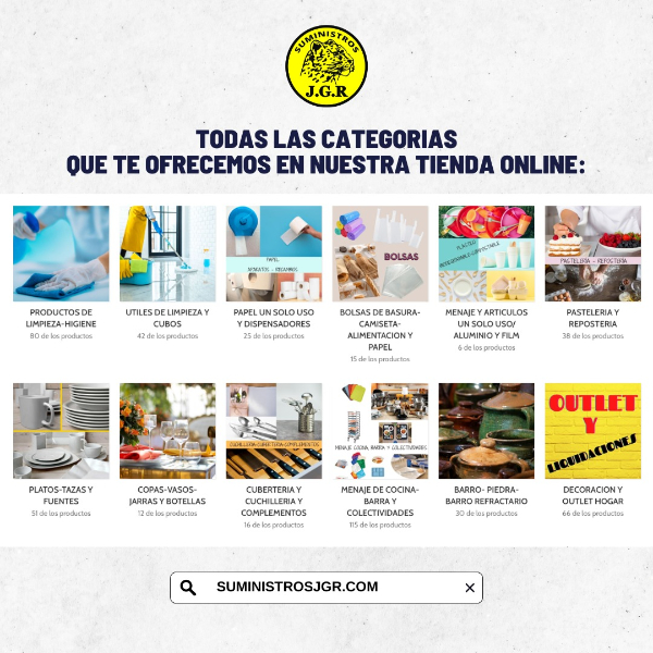 Consigue un 5% de DESCUENTO en compras superiores a 50€ en todos los productos de nuestra página web con el Código: #jaguardescuento ¡Aprovecha esta oportunidad y ahorra en productos de limpieza, menaje, cerámica, vajillas, decoración, barbacoas, productos de cocina, hostelería..! www.suministrosjgr.com
