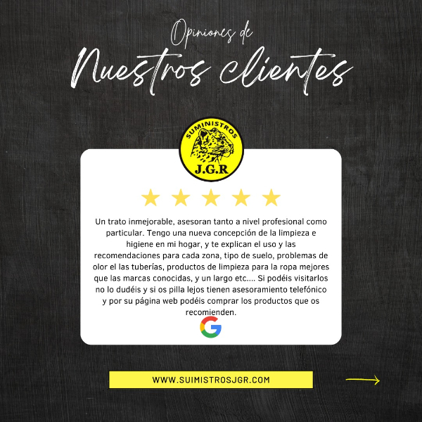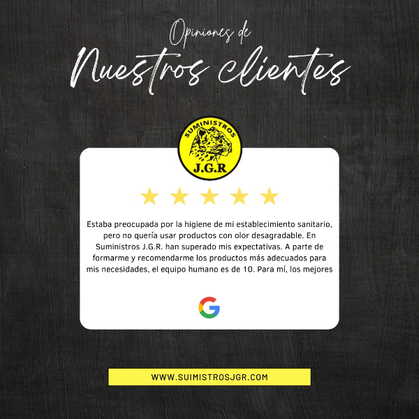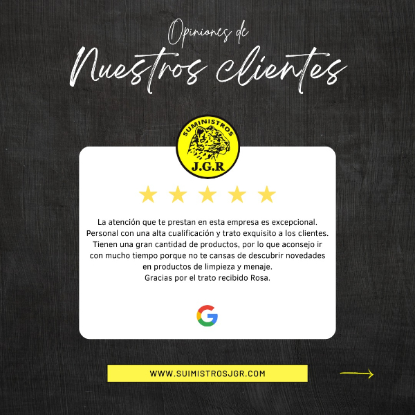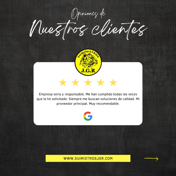 En Suministros JGR nos mostramos agradecidos por las opiniones y reseñas que recibimos de nuestros clientes en Google. Cada comentario es valorado y utilizado para comprender mejor las necesidades y preferencias de los clientes, lo que nos permite mejorar constantemente nuestros productos y servicios. En la empresa nos esforzamos por ganarnos cada estrella que recibimos en las reseñas, buscando siempre ofrecer la mejor calidad y servicio posible.